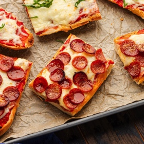 Spread the sauce onto the bread then cover with cheese. Bake for 8 more minutes. Remove the pizza and distribute the grated Pecorino Romano on both sides. Bake until bubbly and golden (about 2-3 more minutes). Remove fromthe oven and let cool for a few minutes. Slice into 4 pieces per side. Enjoy!